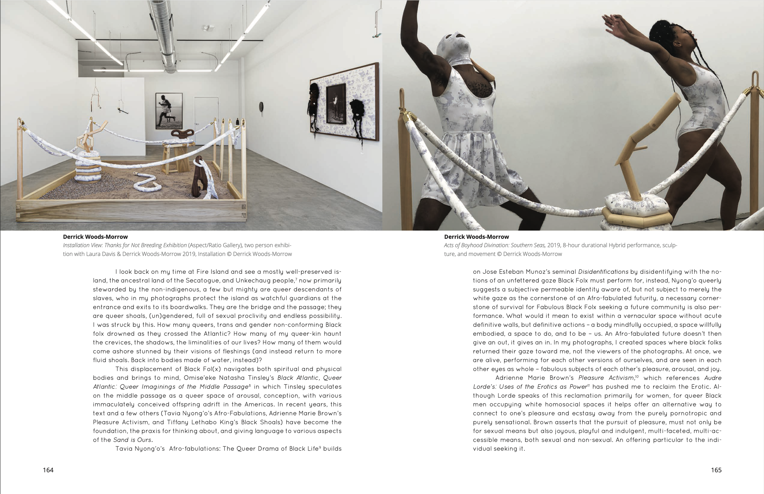 Who owns land and by what means? Derrick Woods-Morrow’s The Sand is Ours compiles an archive of reflections during a summer on Fire Island – a cascading paradise of boardwalks, utopian ideals like no other, romantic hope for inclusionary spaces – none of which actually exist. The boardwalks are broken, the utopia is dystopian. And so, the work developed within The Sand is Ours focuses on struggling to locate a sense of selfhood, a community voice, and a way of being beyond those expectations.